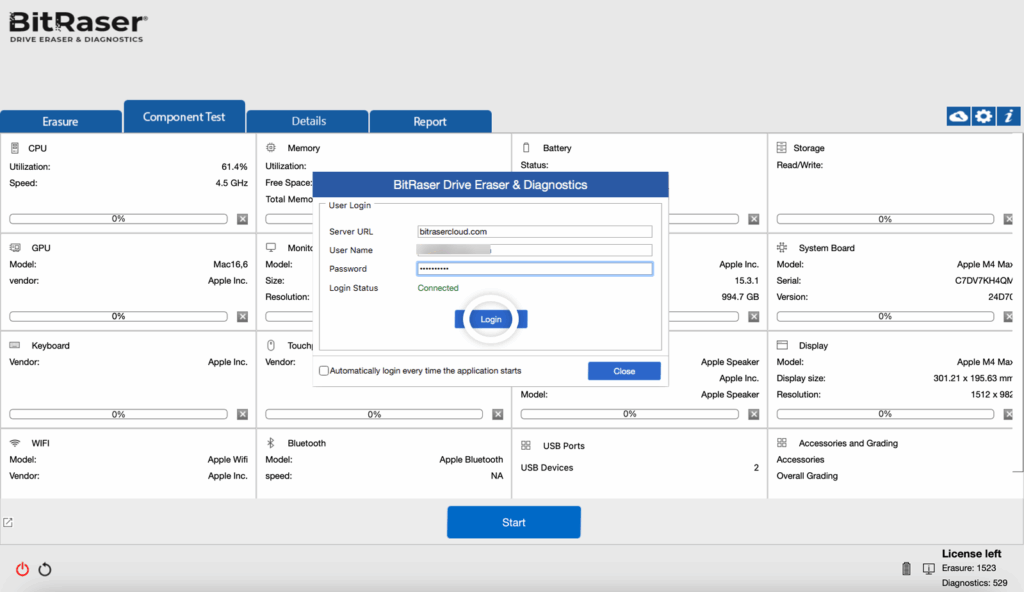 Step 3: Clicca su ‘Start’ per avviare il processo di diagnostica del Mac. L’applicazione ti chiederà di inserire le tue credenziali di accesso per connetterti a BitRaser Cloud e recuperare le licenze per la diagnostica Mac. Inserisci le credenziali che ti sono state inviate via email, quindi clicca su ‘Login’ (vedi Immagine 4).