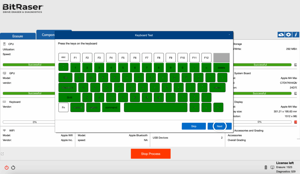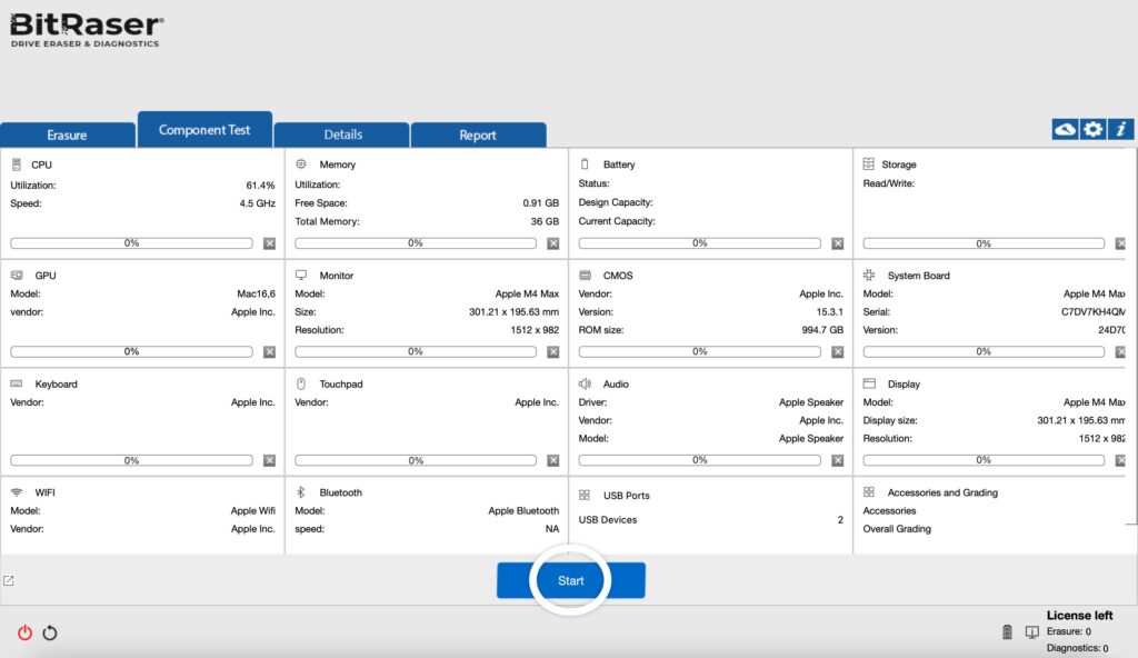 Il software eseguirà prima una serie di test automatici, seguiti da test manuali. BitRaser Mac Diagnostics esegue i seguenti test automatici e manuali:
