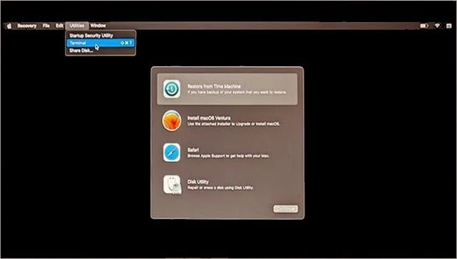 Immagine 1: Nella schermata macOS Recovery, vai su Terminale